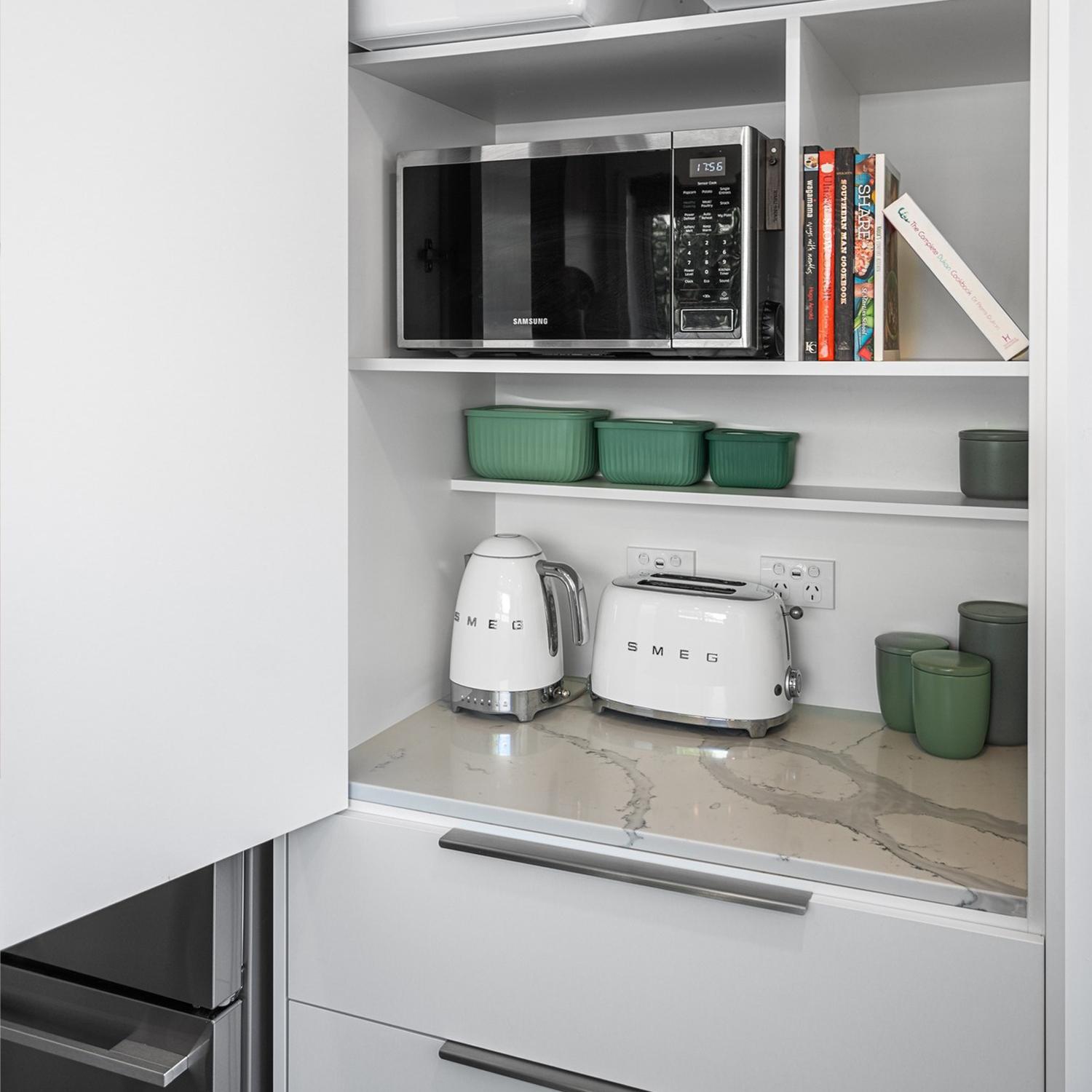 Going higher can give you more storage space. Consider whether you can add cupboards above a benchtop or over the fridge. But remember, you do need to access them.